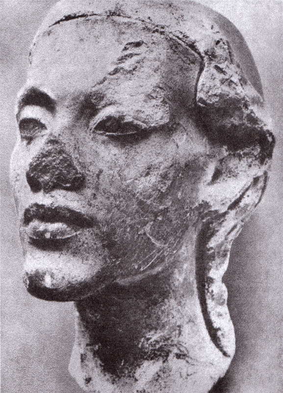 В мастерской Р.49.6 найдены и другие скульптурные изображения. Одно из них принадлежит к числу лучших произведений искусства Ахетатона: это небольшая (20 сантиметров высотой) голова совсем молодого фараона, сделанная из известняка и сохранившая следы раскраски. Как и бюст Нефертити из мастерской Тутмоса, эта голова тоже не предназначалась для статуи, а служила моделью для скульптора. По стилю и высокому качеству работы она близка к лучшим произведениям Тутмоса, и поэтому мы вправе считать, что это портрет, передающий основные, продуманно отобранные черты определенного человека. Но это не Эхнатон, лицо не столь вытянуто и не отмечено худобой, разрез глаз менее узок, рот не такой большой, без толстых губ, причем выступает не верхняя губа, как на портретах Эхнатона, а нижняя. Очень характерны легкие складки по сторонам рта, которые вместе с оттопыренной нижней губой придают лицу выражение капризного высокомерия.