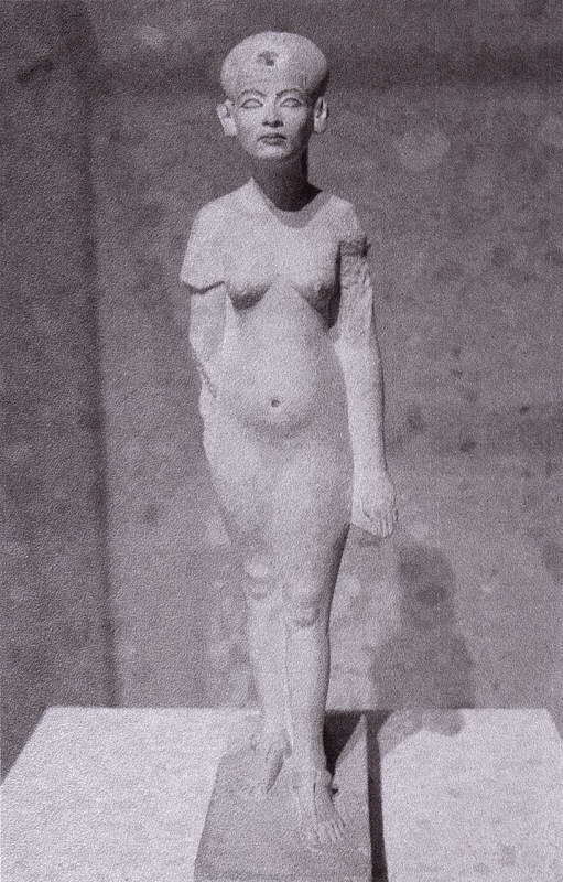 Еще позднее, чем цветной бюст, была создана статуэтка идущей царицы, одетой в облегающее платье, с сандалиями на ногах. Перед нами то же лицо, все еще прелестное, хотя время уже наложило на него свой отпечаток: наметились морщинки, слегка опустились уголки губ, во всем исхудавшем, поблекшем облике сквозит утомление.