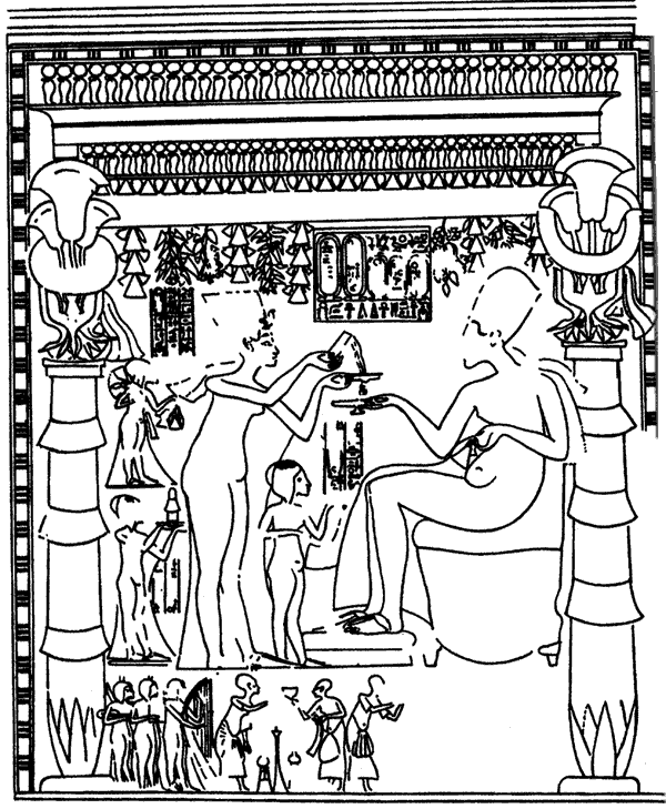 Очень интересная сцена включена в рельефы гробницы вельможи Мерира. Перед нами одна из беседок дворцового сада с легкими деревянными колоннами сложного рисунка и капителями в виде букета папирусов; с потолка свешиваются гирлянды цветов. В беседке сидит Эхнатон, в его руках цветы и плоская чаша, которую он подает Нефертити, а царица наливает ему вино через ситечко. Три царевны протягивают отцу цветы и умащения. Дальше видны музыкантши и придворные.