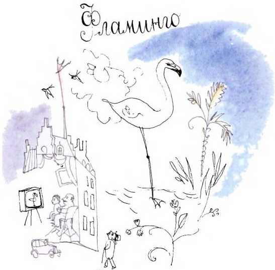 Когда фламинго уснул, нога взяла и отправилась гулять по свету. Пошла куда нога несет. Случилось с нею множество приключений. Сперва она служила колом в заборе, потом метром в магазине тканей, затем перекладиной в спортзале и наконец телевизионной антенной, которая чего только не видит. В том числе и то, как стоит фламинго на одной ноге. И тогда нога подумала про себя: «Бедняга фламинго, надо бы послать ему открытку, чтобы он не беспокоился обо мне». Но опасения ее были совершенно напрасны: фламинго ни о чем не беспокоился. Какое там может быть беспокойство, если он даже не заметил, что у него второй ноги не хватает!