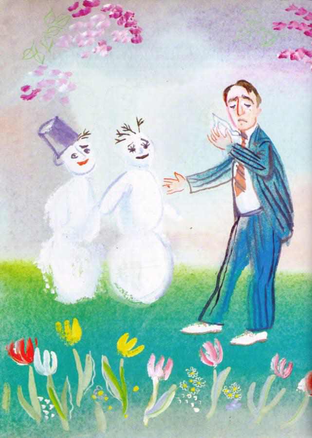 Поистине жизнь невероятна. Два маленьких снеговика восхищаются ласточкой, восхищаются всеми невозможными чудесами вокруг и от наплыва чувств плачут, чем дальше, тем больше. И чем дальше, тем все меньше и меньше становятся. А директор чем дальше, тем чаще отворачивается к солнцу, чтобы чихнуть. И когда наконец он протирает платком глаза, то не видит снеговиков. Лишь в траве, словно гроздь драгоценных камней, переливаются на солнце капельки слез.
