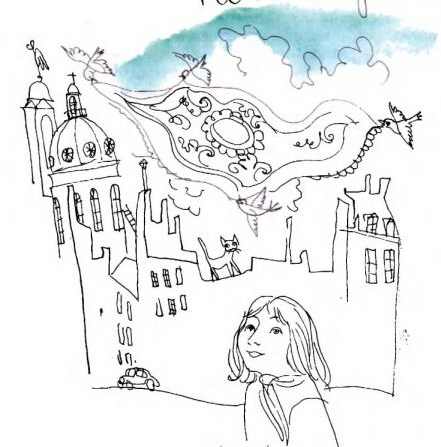 Птицы взяли коврик в свои клювики и полетели над крышами домов и улицами города. Близилось утро, кое-кто уже шел на работу, начали ходить трамваи, и у входа в молочный магазин стояла пани продавщица. Она глядела на небо и старалась определить, какая будет погода. Смотрит это она на небо и вдруг видит – летит коврик!