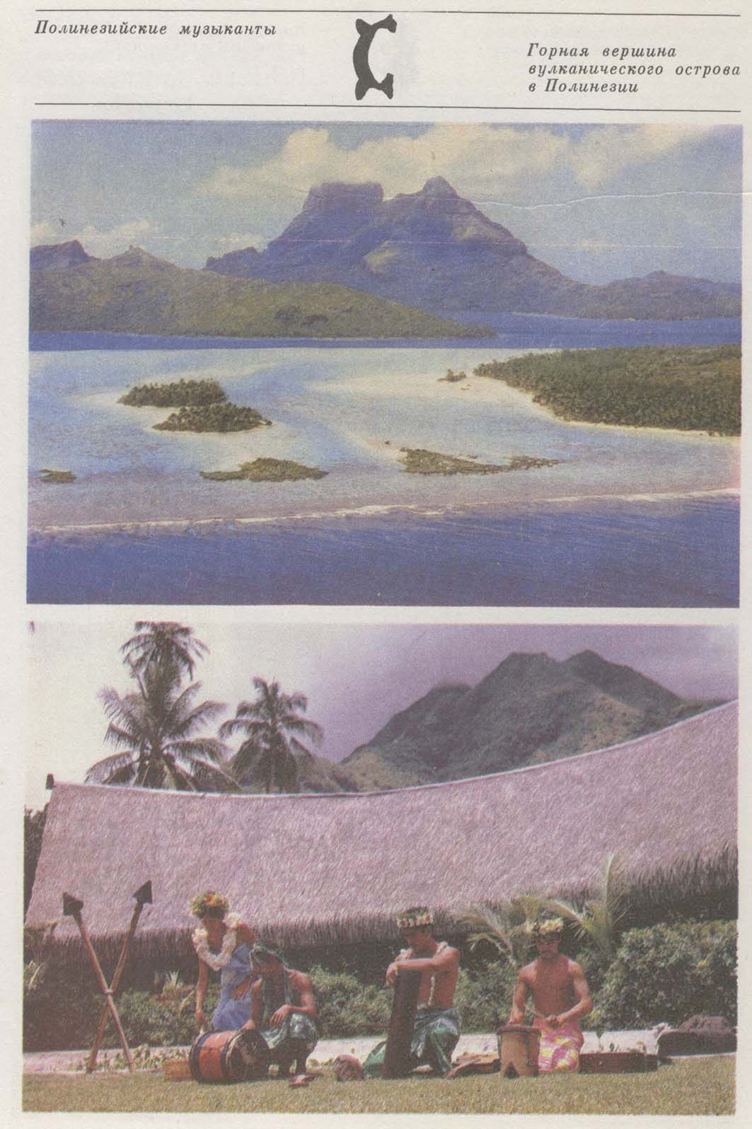 14. Горная вершина вулканического острова в Полинезии. Полинезийские музыканты.