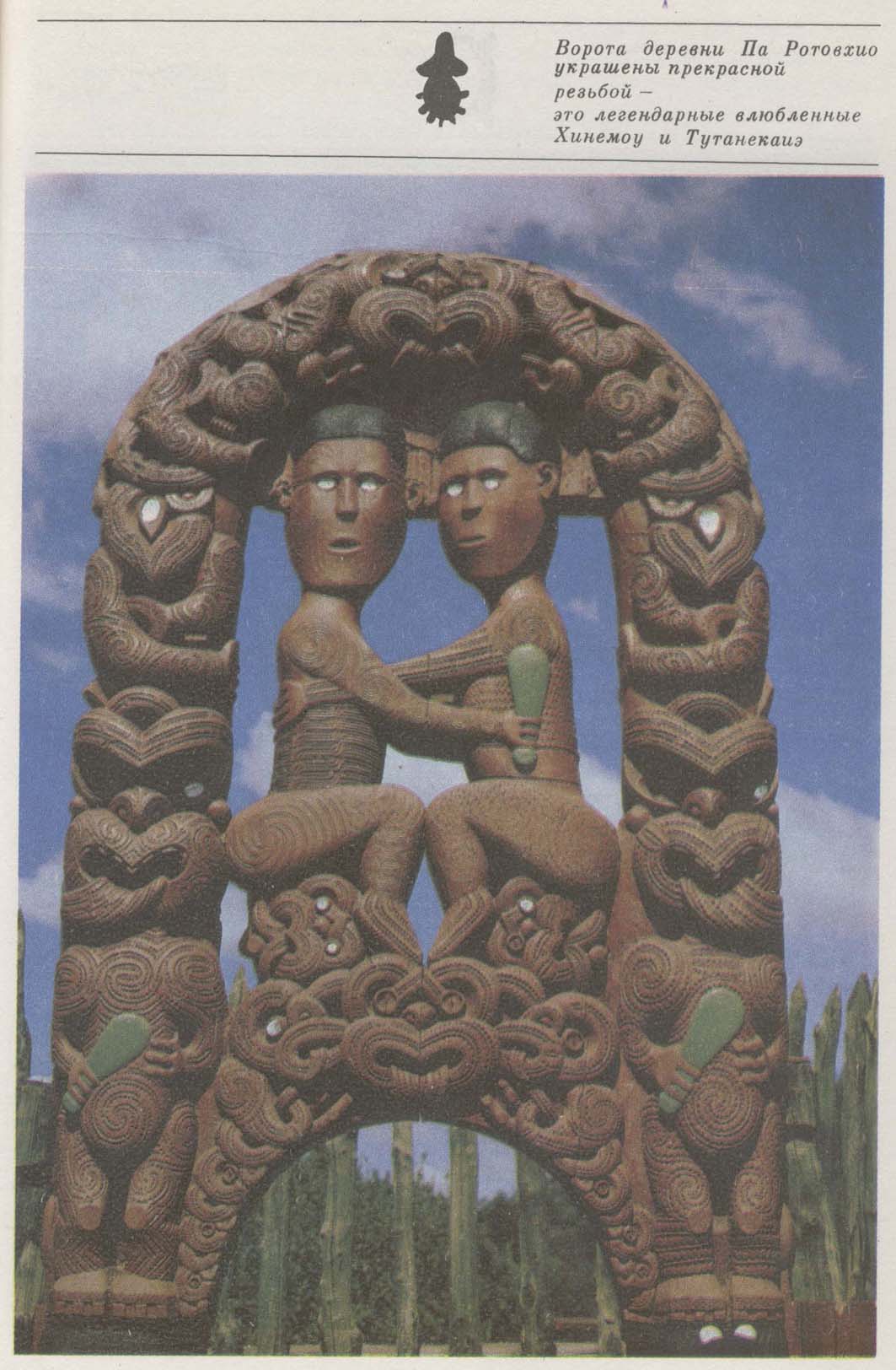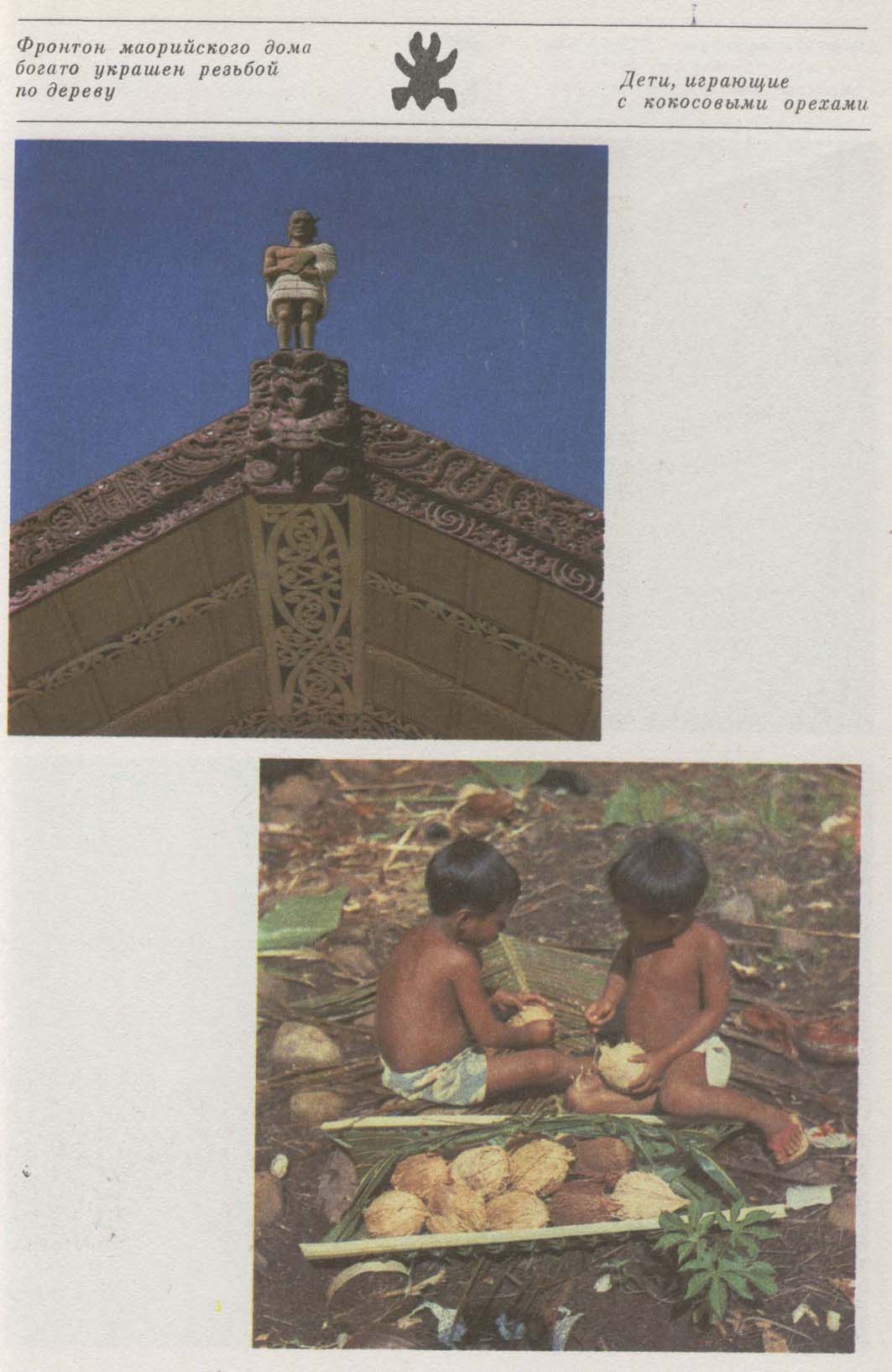 9. Фронтон маорийского дома богато украшен резьбой по дереву. Дети, играющие кокосовыми орехами.