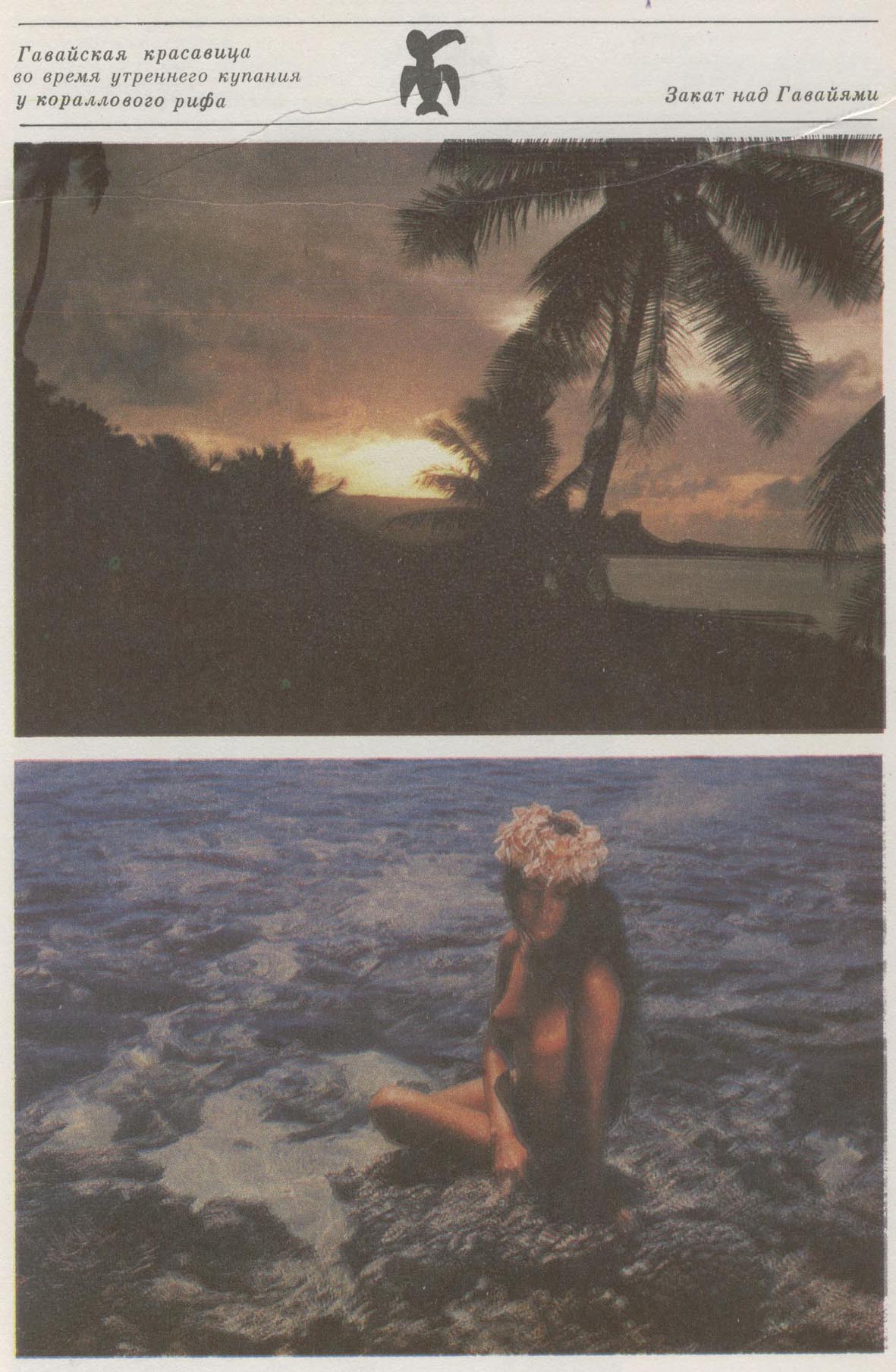 3. Закат над Гавайями. Гавайская красавица во время утреннего купания у кораллового рифа.