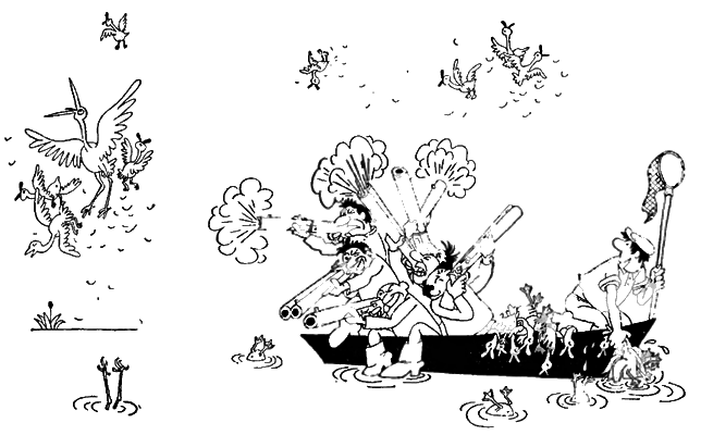 Приходится отступать на море, где налетчики коллективной облавой, с моторами «Вихрь» и прожекторами, бьют все живое, и только утки-поганки, смелые от сознания своей несъедобности, плавают в камышах.