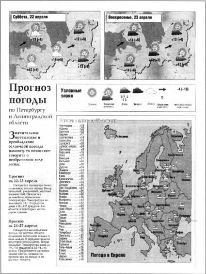 Отличным образцом инфографики может служить эта карта погоды из санкт-петербургской газеты «Cеверная столица». Такие карты наиболее популярны в газетах Западной Европы и США. Они обеспечивают огромную информацию на небольшом газетном пространстве. Другой вид быстро создаваемой инфографики – это карты, показывающие какое-либо событие. Карты могут быть разного размера: большие или совсем маленькие, которые размещают в колонке текста.