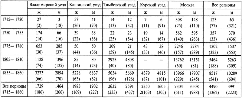 Сведения о продаже земли с крестьянами (см. табл. 4.12) представляют собой последнюю точку обзора для оценки женского и мужского владения крепостными. До XIX в. помещицы охотнее своих собратьев-мужчин продавали населенные поместья (так назывался любой клочок земли, проданный вместе с живущими на ней крестьянами). Здесь снова виден контраст между Москвой и провинцией – в Москве доля продажи земли с крестьянами гораздо выше: за весь период целых 72% проданной в Москве женщинами недвижимости приходится на имения с крестьянами (для сравнения – во Владимире 48%, в Тамбове и Кашине по 35%). При этом во всех уездах женщины продают населенные земли, воспроизводя линию поведения мужчин: продажи увеличиваются в середине XVIII в. и резко возрастают перед отменой крепостного права до уровня в 68% у помещиц и 66% у помещиков[123]123