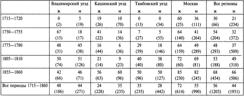 Каждая цифра обозначает процент сделок, заключенных дворянками или дворянами. В скобках в левом столбце указано число сделок с участием мужчин и женщин.