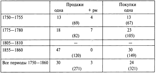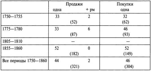 Купчихи отставали от женщин благородного происхождения по части сделок с городской недвижимостью. В приведенной небольшой выборке видно, что до середины XIX столетия поведение купчих напоминало образ действий дворянок в начале XVIII в. (см. табл. 4.14). Среди тех московских купцов, кто вкладывал средства в недвижимость, женщины, действовавшие сами по себе, составляли 13% в 1750—1755 гг. и 23% в 1775—1780 гг. Одна купеческая вдова участвовала в самой дорогой сделке 1778 г.: она купила одну десятую долю завода за 30 тыс. рублей{306}. Но такие примеры были редки, и лишь накануне отмены крепостного права участие купеческих женщин в рынке сравнялось с долей дворянок. При этом, становясь все активнее, купчихи явно предпочитали продавать имущество, а не приобретать. Так, в 1855—1860 гг. на долю женщин пришлось 47% продаж городской недвижимости среди московского купечества и всего 30% зафиксированных покупок[127]127