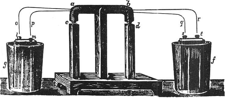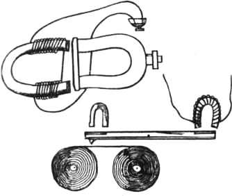 «Основные части прибора, применявшегося в опыте, состоят из нескольких плоских витков с намотанной медной лентой… Катушка N 1 подключена к маленькой батарее, а катушка N 2 (с небольшим числом витков) помещается на ней. Полная изоляция обеспечена вставленной между ними стеклянной пластинкой. Как только ток в катушке N 1 прерывается, в катушке № 2 возникает сильный вторичный ток… Однако этот ток едва ощущается пальцами, и удар от него слаб».