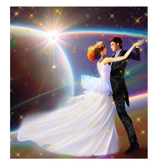 Через миг она вместе с каким-то перепуганным, но ставшим более чётким Максом очутилась там, где представила Кира. Огромная красно-жёлтая полосатая планета зависла на полнеба, а её кольца превратились в цветной и идеально гладкий танцпол, на котором они и стояли.