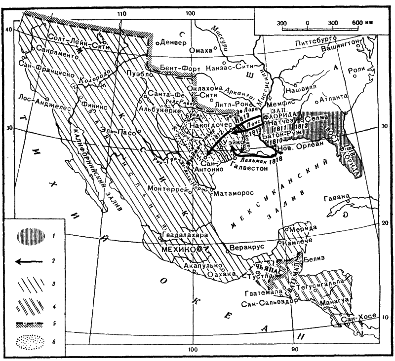 1 – испанские владения в Северной Америке, захваченные США, и даты их захвата; 2 – направления и даты вторжения в Техас вооруженных отрядов из США; 3 – территория вице-королевства Новая Испания к концу колониального периода (1821); 4 – провинции Центральной Америки, входившие в состав империи Итурбиде (1822–1823); 5 – границы Мексики к концу 1824 г.; 6 – мексиканская территория, явившаяся в 20-х годах XIX в. объектом американской колонизации
