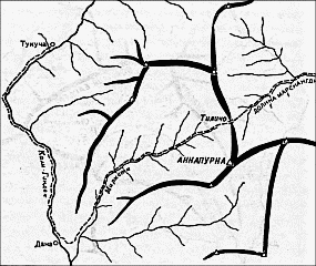 Орография массива Аннапурны по индийским картам (пунктиром показан несуществующий проход Тиличо)