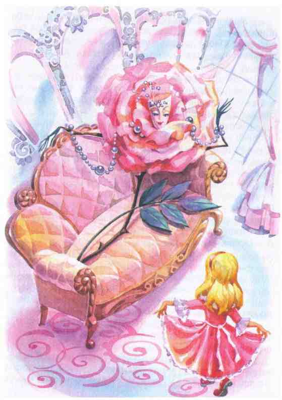 Везде были расставлены диваны, кушетки, пуфы, кресла, банкетки, на которых с грацией герцогинь полулежали розы и вели между собой беседу. Их головки были окружены целыми водоворотами кружев. Розы беспрестанно пудрились большими пуховками, и их дыхание наполняло ароматом всё вокруг. Но самое занятное было вот что: они подзывали к себе высокие узкие зеркала, и те подбегали по их первому кивку. Розы подкрашивали себе губки, расправляли ресницы, а потом улыбкой отпускали зеркала восвояси. Те кланялись и бросались на следующий зов.