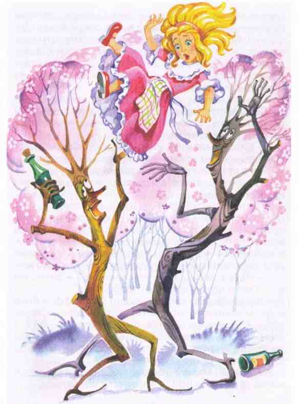 Я почувствовала, что совершенно сбита с толку, и не понимала, о чём ещё спросить, но тут я заметила в руках у деревьев винные бутылки. «Вот незадача-то! Это же пьяные вишни!» – промелькнуло у меня в голове, и я уже хотела идти дальше, но та из вишен, с которой я пыталась вести разговор, сгребла меня в охапку и подбросила ввысь. Я бы наверняка сломала себе шею, но вторая вишня меня подхватила. Я надеялась, что она меня отпустит, но вместо этого она подбросила меня ещё выше. От страха я завопила, но вишни расхохотались ещё пуще и продолжали перебрасываться мною, как мячиком.