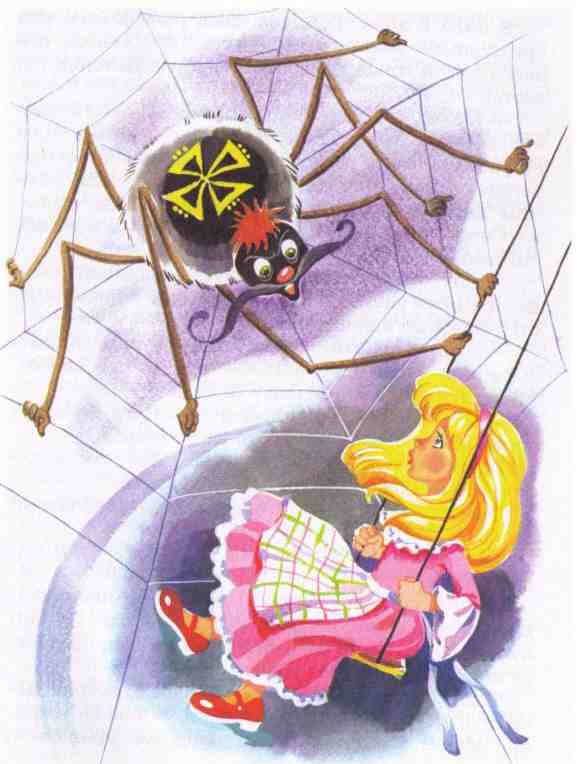 Я качалась, качалась, обмирая от страха и удивления, и вот наконец паук раскачал меня так высоко, что носки моих туфель угодили в самый центр паутины.