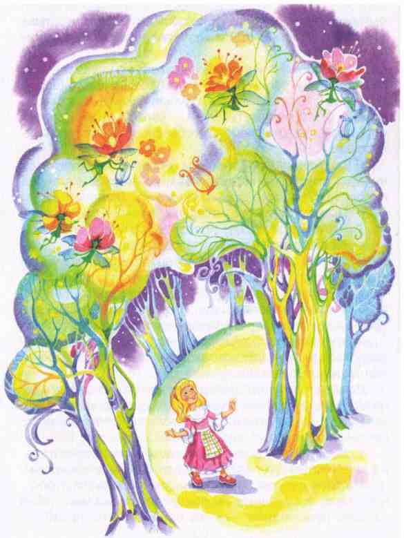 Скоро я пришла в волшебный лес. Он тонул в лунном свете. Казалось, в стволе каждого дерева горит лампочка, потому что все деревья светились. Одни мерцали голубым светом, другие красным, третьи жёлтым, и разноцветные лучи, сливаясь вместе, давали такие нежные оттенки, что, подумала я, такого просто быть не может.