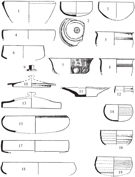 Рис. 2.Образцы «северной чернолощеной керамики»: 1, 3, 5, 8, 10, 17 –из Рупара; 2, 16 –из Райгира; 4, 9, 12, 18 –из Трипури; 6 –из Бахала; 7 – из Таксилы (Бхир-Маунд); 11, 13 –из Хастинапуры; 14, 15, 19 –из Ахиччатры