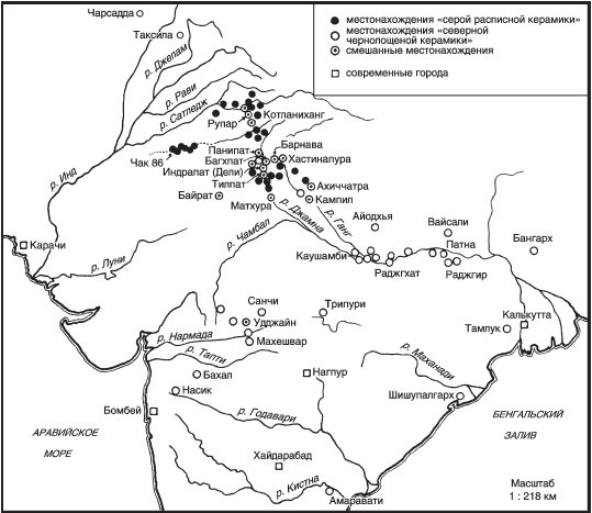 Мне кажется, что образцы СЧК, найденные на северо-западе в Чарсадде (в р-не Пешавара), где в 1958 г. были обнаружены несколько слоев, содержащих более дюжины образцов СЧК; в Уддергаме, Сват (где экспедиция профессора Дж. Туччи обнаружила несколько образцов в слое, относящемся к III в. до н. э.) и даже в Таксиле, можно соотнести по времени с распространением влияния Маурьев за пределы гангского бассейна после 323 г. до н. э. Другими словами, можно предположить, что период распространения СЧК на северо-западе Индии – 320 – 150 гг. до н. э., не исключая возможность ее более раннего появления в различных частях бассейна Ганга. В Хастинапуре, в долине Ганга, найдено более 100 образцов СЧК на глубине 2,7 метра. В слое, относящемся к более позднему периоду, в котором были найдены монеты из Матхуры, образцов СЧК уже не было.