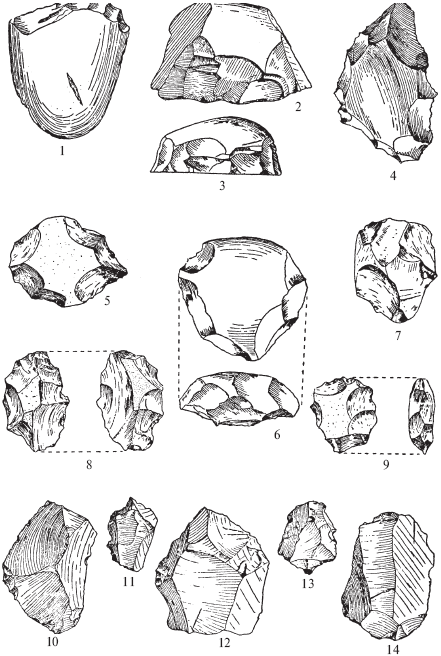 Рис. 4.Раннесоанские орудия: 1 – 4 –галечные орудия; 5 – 9 –дисковидные нуклеусы; 10 – 14 –«клектонские» отщепы