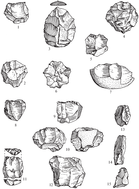 Рис. 5.Позднесоанские орудия: 1 – 6 –нуклеусы; 7 – чоппер; 8 – 12 –нуклеусы; 13 – 15 –отщепы левалуа