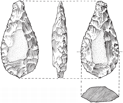 Несколько южнее, на материковой береговой равнине, в Гиддалуре, севернее Мадраса, было обнаружено значительное количество орудий, подробно описанных и классифицированных в 1930 г. Л. Каммиадом и М. Баркиттом. Латерит – это глинистая масса красного цвета, содержащая запасы железной руды и бокситов; она образовалась в результате как выветривания каменных пород, так и чередования дождливых и сухих сезонов. Именно в латеритном слое равнины, образовавшейся на месте прежних болот и лесов, были обнаружены первые следы человеческой жизни. Самая ранняя группа орудий (группа 1) была представлена в основном рубилами – неокатанными, со следами от латерита. Изделия этой группы представляют архаичные, грубо оббитые гальки кварцита с неоформленным краем, и их значение для типологической классификации каменных орудий не следует переоценивать. Среди них находился один нетипичный экземпляр оригинальной формы: плоская нижняя часть его была сформирована в результате скола большого отщепа, а килеобразная «спинка» представляет собой первоначальную поверхность гальки. Такого типа орудия были обнаружены в Западной Виктории [56]56