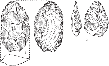 Рис. 8.Образцы орудий «мадрасской техники», обнаруженные в Аттирампаккаме: 1 –овальное рубило; 2 –нуклеус со вторичной ступенчатой оббивкой вдоль рабочего края