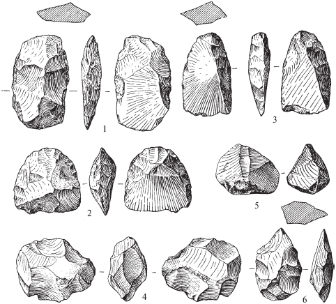 Рис. 10.Образцы орудий группы 1, найденных в Гиддалуре: 1 – 3 –кливеры; 4 –дисковидный «клектонский» нуклеус; 5 – галечный чоппер; 6 –маленькое рубило с двусторонней оббивкой
