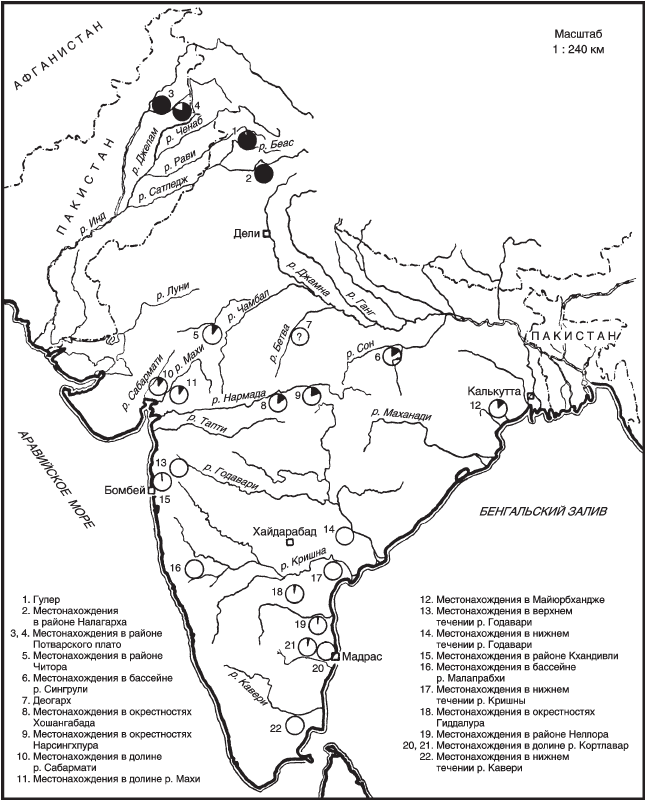 Казалось бы, связующей нитью между северными и южными районами являются найденные останки животных, которые уверенно можно отнести к среднему плейстоцену. Так, в окрестностях Невасы, округ Ахмаднагар на реке Правара, притоке Годавари, в 240 километрах северо-восточнее Бомбея в слое сцементированного галечника (первый слой), покрытого двумя другими галечными слоями (второй и третий) и толстым слоем желто-коричневого ила, были обнаружены остатки челюсти быка (Bos namadicus); а в схожем слое галечника самой Годавари были обнаружены кости слона (Elephas namadicus) и гиппопотама. Если мы можем соотносить фауну реки Соан и Нармады, то делать то же самое относительно фауны Соан и Правари на сегодняшний день сложнее. Так, в первом слое базальтового галечника Правары вместе с останками Bos namadicus были обнаружены рубила и кливеры ранне-и среднеашельского типа, выполненные из оливинового долерита [55]55
