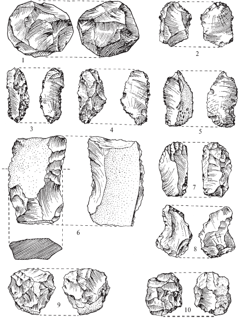 Рис. 13.Орудия из группы 2, найденные в Невасе, в долине р. Правары: 1 –дисковидное орудие из кремнистого известняка; 2 –отщеп с подготовленной ударной площадкой из халцедона; 3 – 5 –пластины из халцедона с затупленной спинкой и частично ретушированной нижней частью; 6 –скребло с «чешуйками» из кремнистого известняка; 7 – 8 –скребла из халцедона; 9 – 10 –дисковидные орудия из халцедона