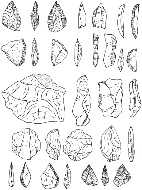[Закрыть]. Их трудно отнести к какой-то уже известной категории и, до окончательного прояснения, можно временно охарактеризовать как «верхнеправарские». Выполнены они из агата, кремнистого известняка, халцедона и яшмы; основные формы – различные разновидности скребел, скребков, пластин и нуклеусов. Некоторые нуклеусы можно отнести к клектонской технике изготовления, некоторые, наоборот, выполнены путем отжима и имеют волнистое неоформленное лезвие. Среди пластин экземпляр в 2,5 сантиметра в длину с необработанной спинкой и ретушью на рабочем крае, при более тщательной обработке превращающийся в скребок; также встречаются полукруглые скребки, скребки с ретушью и скребки из пластин, говорящие о высокой технике изготовления. Многие отщепы напоминают левалуа, имеют фасетированную ударную площадку и ретушь на нижней части. Два-три заостренных орудия можно отнести к резцам, редко встречающимся в Индии.