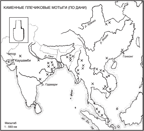 За пределами Индии образцы хорошего качества были обнаружены в Бирме, а грубые болванки вперемешку с тщательно обработанными конечными продуктами встречаются по всей территории Юго-Восточной Азии. Это и Малайзия, и Индокитай, где они представлены образцами так называемой «баксонианской» культуры к северу от Ханоя и культуры Сомронг-Сен в Камбодже и Таиланде. Навряд ли есть основание сомневаться в том, что общины, использовавшие мотыги с плечиками, также использовали керамику и изделия из бронзы и меди, хотя такие образцы и не были обнаружены археологами-раскопщиками. Остатки, имеющие, по-видимому, отношение к этим культурам, обнаруженные в прибрежных районах Тонкинского залива, относятся к периоду правления династии Хан (202 г. до н. э. – 220 г. н. э.). В Китае грубо выполненные образцы мотыг встречаются на территории от Гонконга до провинции Хунань и провинции Сычуань в долине Янцзы [73]73