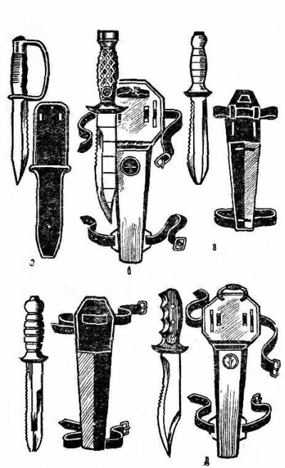 У нас, к сожалению, не выпускают специальных подводных ножей. На рис. 10 показаны некоторые хорошие зарубежные модели: американские «профессионал» а и «мастер» б, французские «спиродаг» в и «пойнард» г. Хорошо отвечает требованиям подводного стрелка нож модели «катран»[10]10