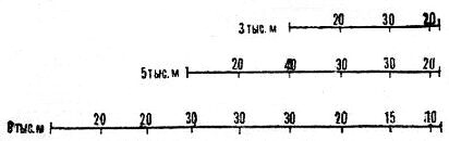 Постепенно (в системе круглогодичных тренировок) доводят это упражнение к периоду соревнований до ежедневного бега на 8000 м с восемью задержками дыхания. Любой спортсмен, начавший заниматься задержками в беге, очень скоро убедится, что задержки дыхания не только не увеличивают кислородной задолженности в беге, но, наоборот, удивительно активизируют весь процесс внешнего и внутреннего дыхания, делают дыхание в беге легким и ненапряженным. На графике показана длительность задержек дыхания на дистанциях 3, 5 и 8 тыс. м.[12]12