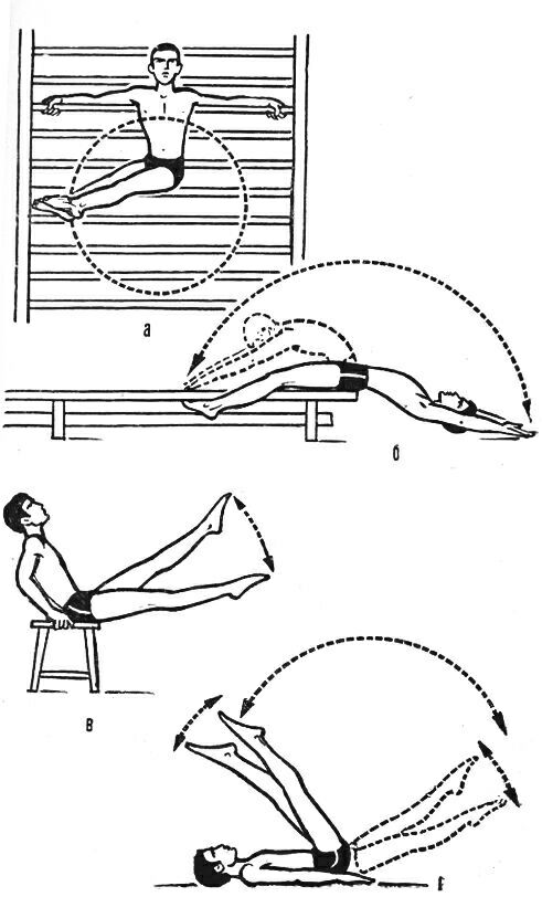 Большое значение для спортсмена – подводного стрелка имеют упражнения, развивающие мышцы брюшного пресса (рис. 12, а, б), упражнения для развития и укрепления мышц движения ног в кроле в (см. рис. 12), упражнения для одновременного развития мышц ног и пресса г, занятия со штангой и т.п.
