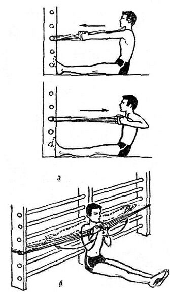 Для специального развития мышц рук, на которые ложится очень большая нагрузка при многократном заряжании подводного оружия, служат упражнения с резиновыми или пружинными эспандерами (рис. 13, а, б).