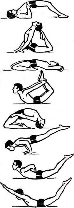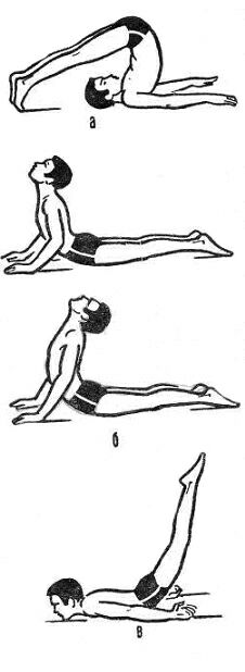 4. Лежа лицом вниз на подстилке, положите обе руки ладонями вниз под плечами. С полным вдохом медленно поднимайте, насколько можно, голову. Затем, напрягая мышцы спины, поднимайте плечи и корпус все выше и выше. Руки не помогают движению, а только препятствуют корпусу опуститься обратно. Почувствуете, как напряжение в шее постепенно распространяется все дальше и дальше по позвоночнику. В последней фазе можно помочь руками отгибанию корпуса назад. Область пупа не должна отрываться от пола. В этом положении следует оставаться до 30 сек., задерживая дыхание. Потом с медленным выдохом возвращайтесь в исходное положение. Повторите 2-3 раза. Это упражнение успокаивает нервную систему, развивает гибкость позвоночника и мышцы спины и пресса. Кроме того, это положение тренирует задержку дыхания при мышечном напряжении (рис, 15,б).