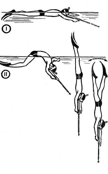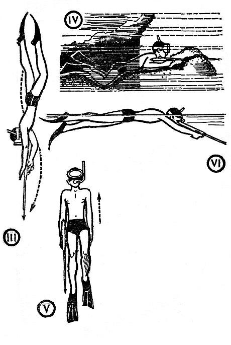 Вторая фаза – нырок (рис. 17, II). Его выполняйте с таким расчетом, чтобы сообщить телу первоначальное движение вниз с минимальной затратой энергии. Из горизонтального положения, помогая гребком рук, вытянутых до этого вперед – в стороны, и ласт, энергично, но не резко выбросьте корпус вперед на поверхность, волнообразно, как это делают дельфины, округлым движением «воткнитесь» в воду. Когда корпус примет вертикальное положение, выпрямите ноги над водой. Под весом ног и ласт спортсмен начинает погружение. Работать ластами можно начинать только тогда, когда они скроются под водой.