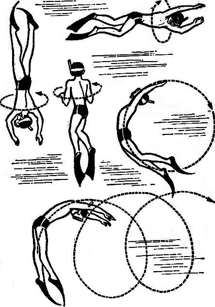 Особое место в системе тренировок в воде подводного стрелка занимают элементы, совершенствующие работу вестибулярного аппарата. Они состоят из выполнения самых различных фигур «высшего пилотажа» под водой. Это погружение и всплытие «штопором», прохождение дистанции горизонтально медленным «штопором», вверх лицом, «мертвые петли», «спираль» и т.п. (рис. 18).
