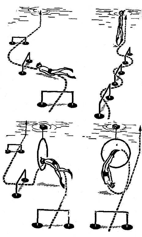 Челночное ныряние. Это упражнение следует считать основным тренировочным элементом подводного стрелка для выполнения программы соревнований в естественных водоемах. При систематическом и длительном выполнении его воспитываются и тренируются важнейшие физические качества спортсмена, необходимые ему в самом сложном упражнении состязаний – в стрельбе по движущимся целям (рыбам) в природных условиях на открытых водоемах.