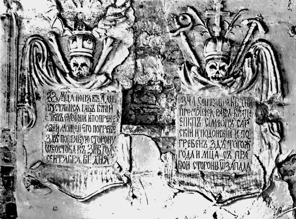 Надгробные плиты сарайских епископов (епископов Сарских и Подонских). Успенский собор. Крутицкое подворье. Москва. Фото М. П. Волкова. 1900 г.