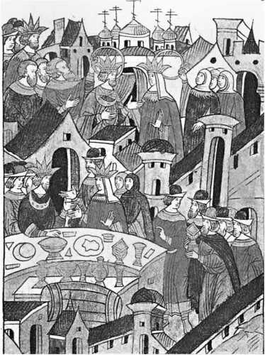 Иван Грозный на свадьбе Симеона Бекбулатовича. Миниатюра из Лицевого летописного свода. XVI в.