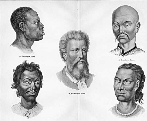 Типы человеческой расы: эфиопская, монгольская, кавказская (в центре), малазийская, американская.