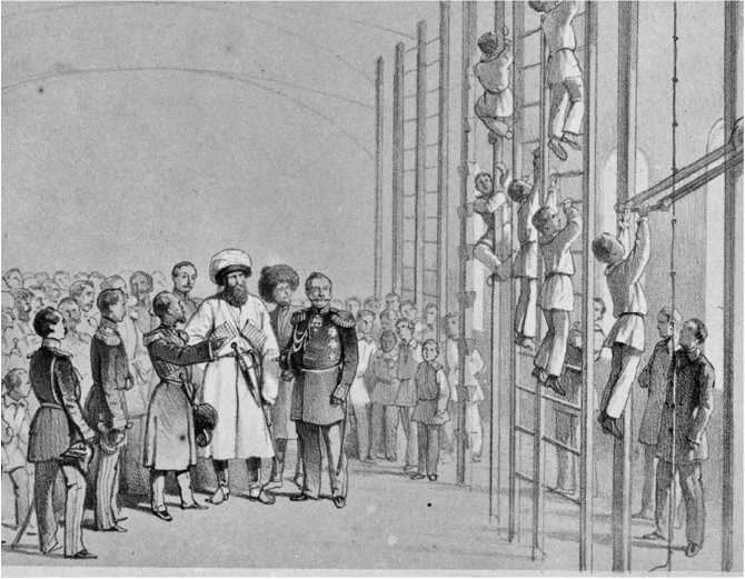 Посещение Шамилем I-го Кадетского корпуса, где был воспитан его покойный сын Джемалуддин. Русский художественный листок, № 31. 1859 г. В. Тимм.