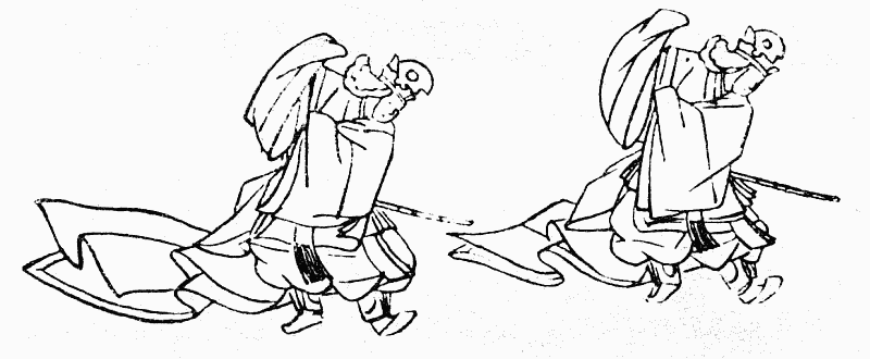 «На согнутых ногах» (Ракусон) – танец корейского происхождения, исполнялся двумя танцорами в страшных масках с клыками (у одного танцора маска была зеленого цвета, у второго – синего). Чаще всего этот танец исполняли во время состязаний по стрельбе из лука, сумо (рис. 8).