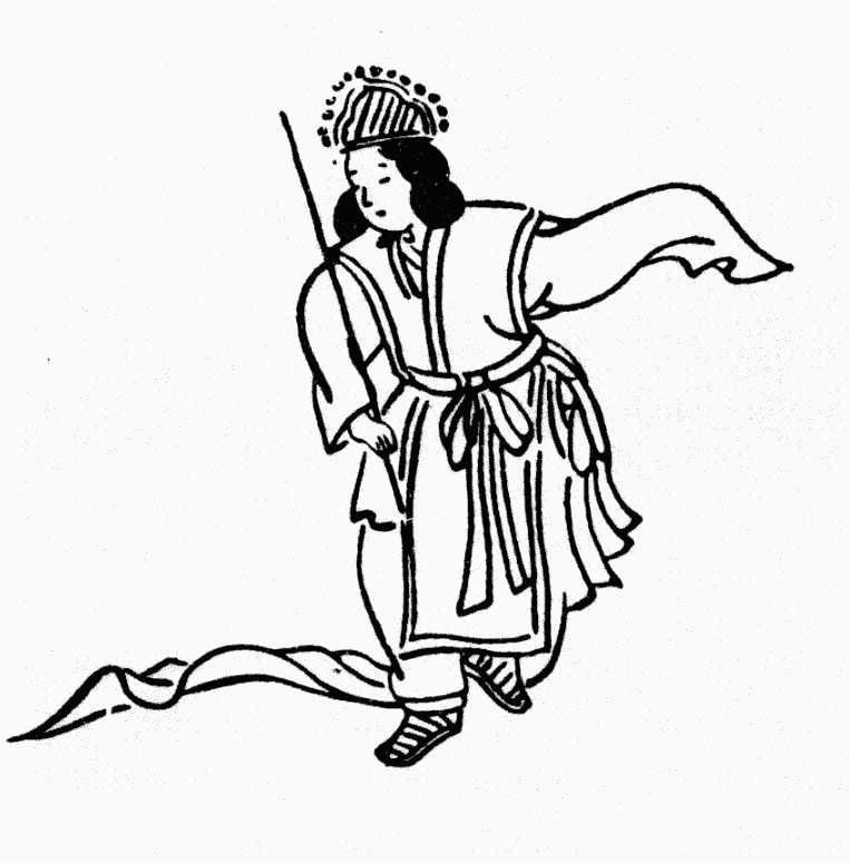 «Трели весеннего соловья» (Сюннотэн) – танец китайского происхождения, до наших дней не дошел. Существует предание, что император танской династии Гао-цзун (650–684), услыхав однажды пение соловья, повелел сложить мелодию, передающую это пение. Мелодия и танец проникли в Японию в самом начале VIII в. Танец исполнялся десятью, шестью или четырьмя танцорами в особых головных уборах, по форме напоминавших птичью голову (рис. 14).