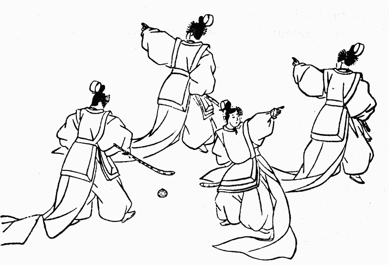«Игра в мяч» (Дагюраку) – танец китайского происхождения, завезенный в Японию в первой половине X в. Его танцевали четыре или шесть танцоров, движениями своими имитируя игру в мяч. Этот танец исполнялся, как правило, в дни различных состязаний (рис. 6).