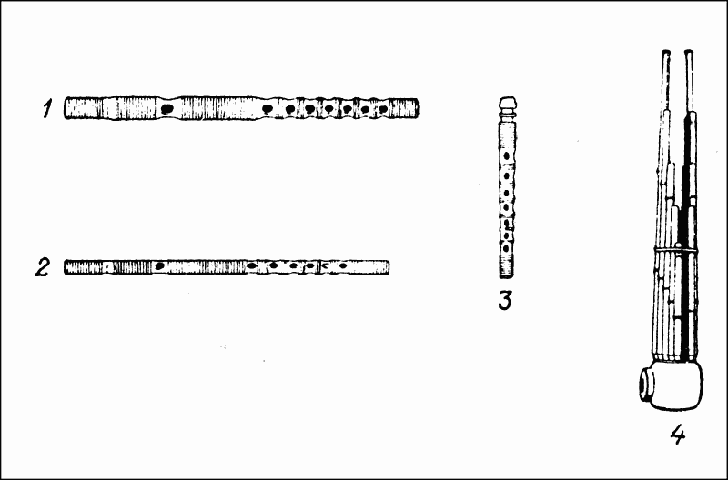 Рис. 16. Флейты: 1. продольная флейта («ёкобуэ»);