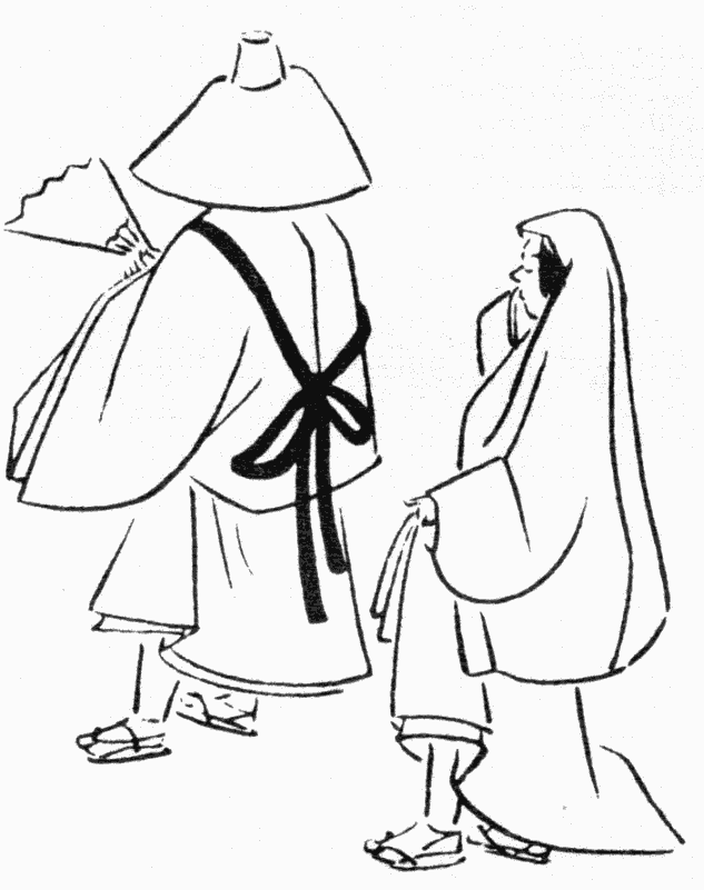 Дорожный женский костюм (цубосодзоку) (рис. 24) – одежда, в которой полагалось совершать паломничества в монастыри и пр. Одно из надетых друг на друга платьев набрасывалось на голову, а поверх него надевалась широкополая шляпа (итимэгаса).